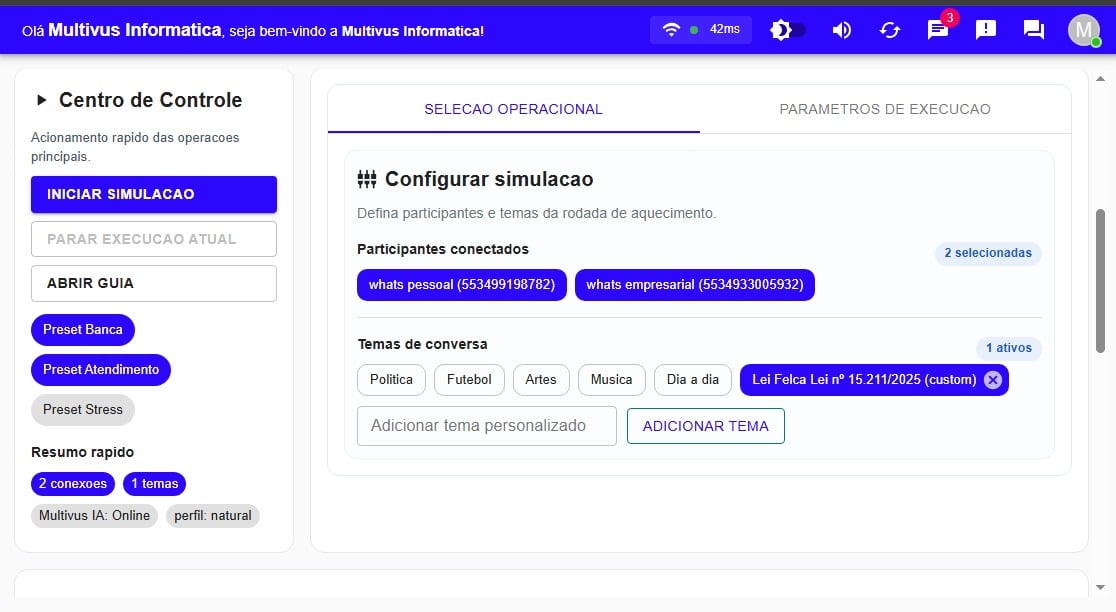 Sistema completo para simular conversas reais entre múltiplos números, aumentando a naturalidade das interações e reduzindo riscos de bloqueio.
