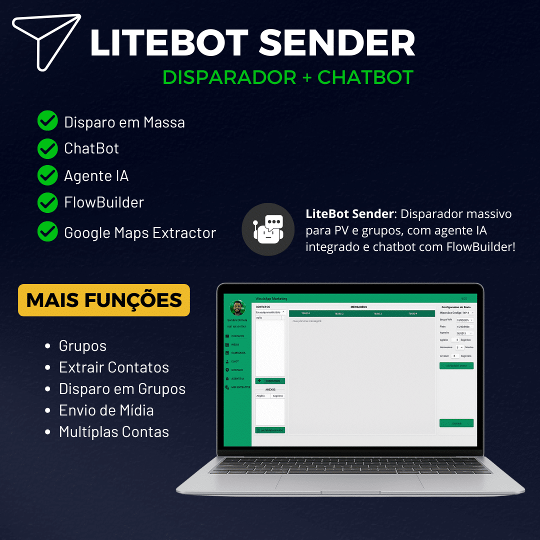 Não perca tempo, experimente o Litebot Sender hoje mesmo e descubra como ele pode transformar o seu negócio. Esteja à frente da concorrência e conquiste o sucesso que você sempre almejou.