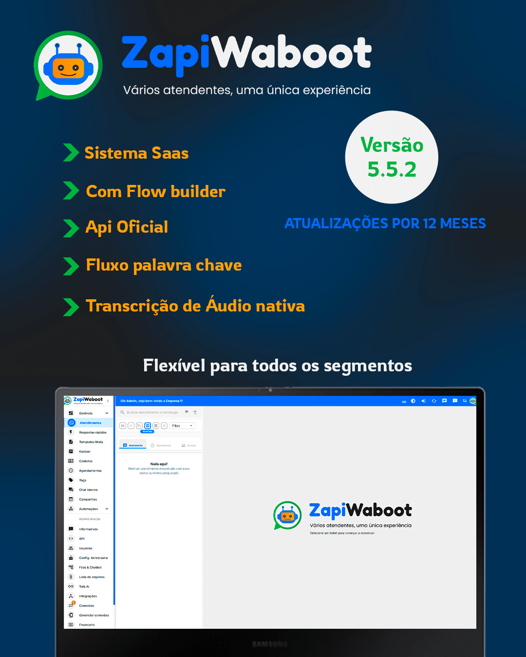Plataforma Multi Atendimento para WhatsApp Com o nosso chatbot você conecta vários atendentes a um único número de WhatsApp automatizado criando fluxos de atendimento, transcrição de aúdio nativa, API Oficial e com flowbui